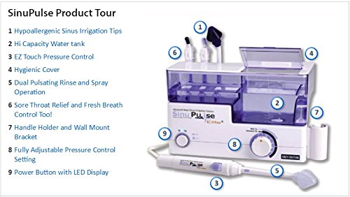 Leiden Sie an Allergien und Nebenhöhlensymptomen wie Kopfschmerzen, pharyngealem Sekretfluss, verstopfter Nase und Entzündungen? Das SinuPulse Elite Nebenhöhlenspülsystem kann helfen, die Symptome natürlich, ohne Medikamente zu lindern! Empfohlen von HNO-Ärzten, Allergologen und Kinderärzten. Die pulsierende Spülung des SinuPulse Elite reinigt Nase und Nebenhöhlen von Allergen, Staub, Schmutz & Pollen und verbessert den ziliaren Transport. Wie ein Nasenspüler hilft das SinuPulse bei nebenhölenbedingtem Schnarchen und umweltbedingten Beschwerden, die durch Luftverunreinigungen, Rauch oder Smog ausgelöst werden können. SinuPulse Elite mit IntelliPulse-Technologie ist ein modernes nasales Spülsystem. Seine Entwicklung basiert auf ca. 30 Jahren Erfahrung mit pulsierenden Spülsystemen. Bei seiner Entwicklung wurde auf einfache Anwendung, Bedienkomfort, Leistung und Qualität geachtet, sodass SinuPulse Elite die gesunde Alternative für alle bietet, die an Allergien und Problemen der Nasennebenhöhlen leiden. Es bietet: SinuMist-Spitze zur Reinigung der Nebenhöhlen, flexible Spülspitzen für maximalen Komfort, kalibrierte Pulsfrequenz zur Verbesserung des ziliaren Transports, einstellbarer Fluss für maximalen Komfort, Pause/Ein/Aus-Schalter am Griff, großer Wassertank mit Skala für das einfache und präzise Mischen der Lösungen, verstopfungsfreier Betrieb, UL- /CE-Zulassung, FDA-Registrierung. Das System umfasst: SinuPulse Elite Spülsystem (netzstrombetrieben), leicht zuzubereitende SinuAir Salzlösung (30 Beutel), flexible Nebenhöhlenverlängerung, SinuMist-Spitze, Standard- und Sprüh-Rachen- und Zungenreiniger, Kurzanleitung (Deutsch) und Broschüre „Sinus Survival Health Tips“ von Dr. Robert Ivker (Englisch). Ausführliche deutsche Bedienungsanleitung ist online verfügbar. Die Kehlespitzen bieten Linderung bei Entzündungen und eine Verbesserung des Atems z.B. bei Tonsillensteinen oder -krypten.